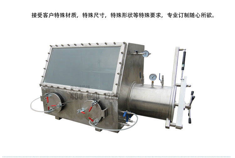 真空手套箱主要由主箱體和底座組成,如用戶有其它特殊要求,也可以根據需要進行設計或改造;箱體上有二到三個手套操作接口,操作箱迎面為有機玻璃,視角廣闊,操作者能夠清楚地觀察到箱體內的操作過程,使得操作過程較直觀地展現在操作者的眼前。箱體上有二個真空球閥,用戶可根據需要使用。球閥的內外安裝接水嘴,在需要通水或通氣的情況下可由此接入。箱體內裝了照明燈泡和多孔插座。