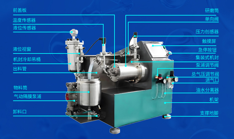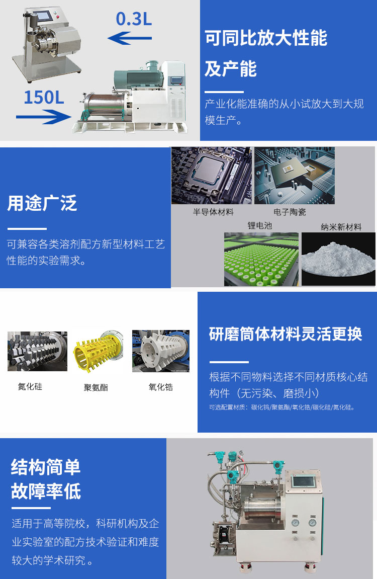 納米砂磨機已廣泛應(yīng)用于多個領(lǐng)域:在新能源行業(yè),用于鋰電池正負(fù)極材料的納米化處理;在電子材料領(lǐng)域,用于MLCC陶瓷漿料、電子漿料的制備;在生物醫(yī)藥行業(yè),用于納米藥物的制備;在涂料油墨領(lǐng)域,用于高端納米顏料的分散研磨。